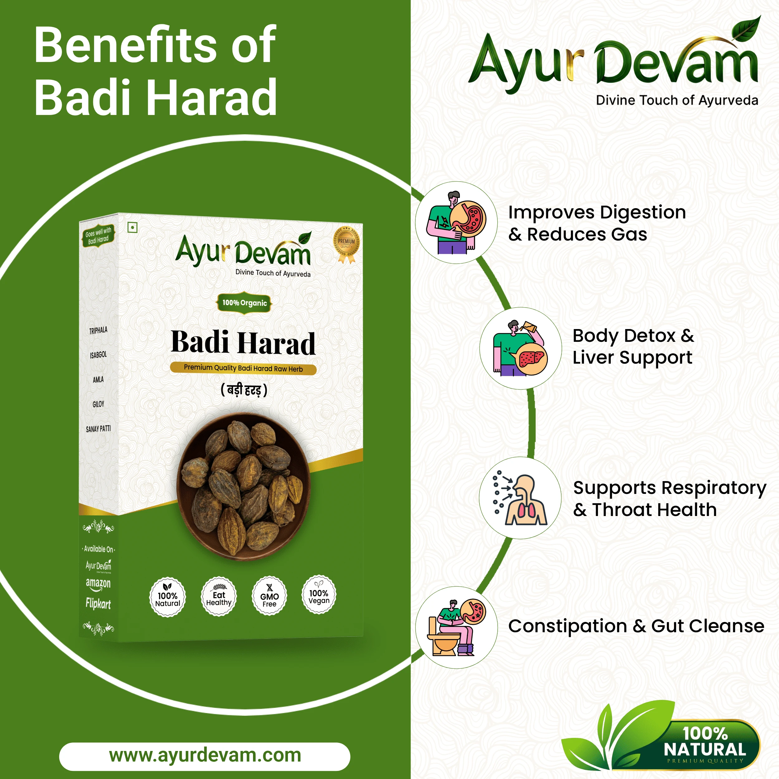 In its raw, whole form, Badi Harad retains maximum natural potency and can be used in various traditional preparations. It helps regulate digestion, relieve constipation, and support the body’s natural detox process.