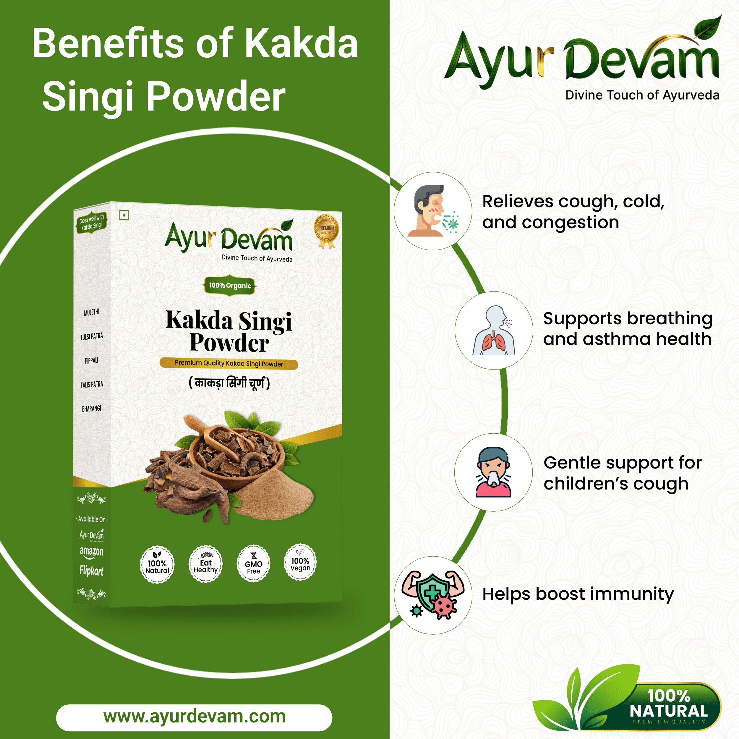 Kakda Singi Powder is 100% pure and free from chemicals, additives, and preservatives, making it a safe and natural choice for daily herbal care. It can be easily incorporated into your routine for maintaining respiratory wellness and boosting immunity.
