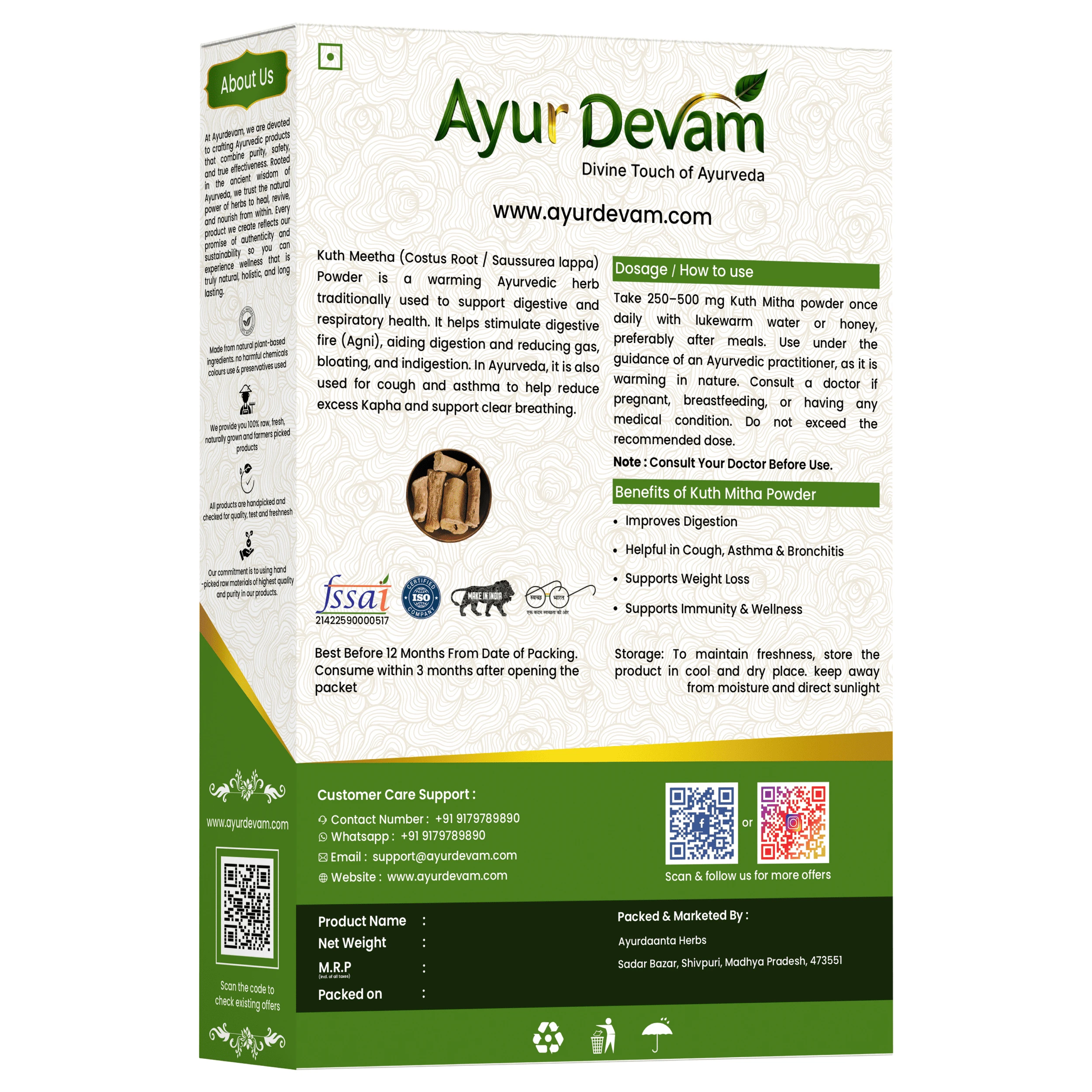Kuth Mitha helps in maintaining digestive balance, promoting liver health, and enhancing physical and mental strength. Its natural aromatic flavor also makes it ideal for preparing Ayurvedic decoctions, powders, and herbal formulations at home.