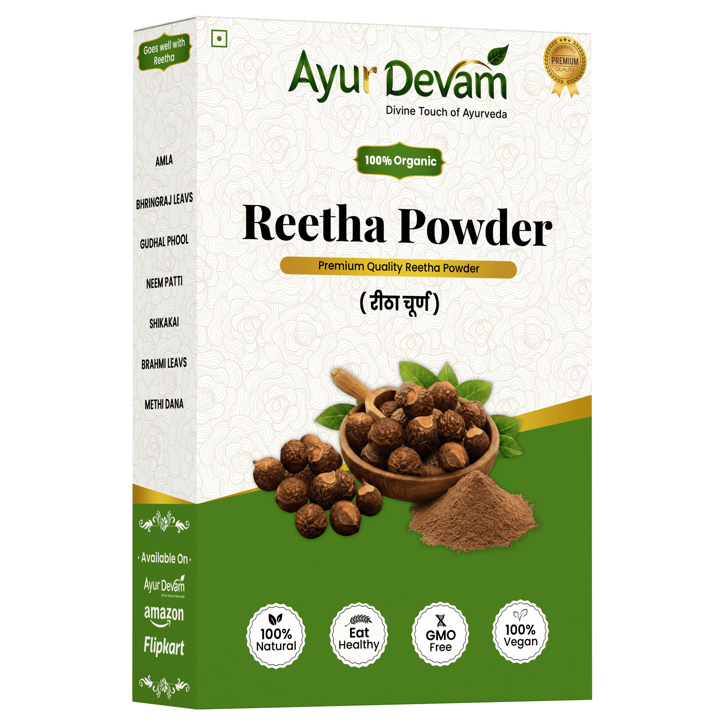 Reetha powder also helps strengthen hair roots, reduce dandruff, and promote healthy, shiny hair. It can be used alone or combined with other herbs like amla and shikakai for enhanced results.