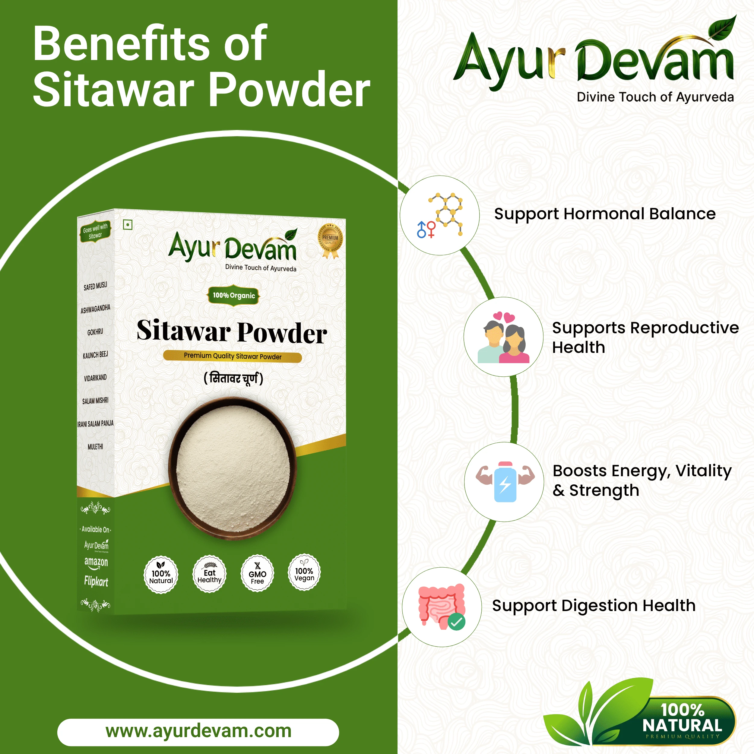 Sitawar Powder, also known as Shatavari Powder, is a premium-quality natural herbal supplement made from pure Asparagus racemosus roots. In traditional Ayurveda, Sitawar has been revered as a rejuvenating rasayana herb, especially known for supporting women’s health, hormonal balance, lactation, and overall vitality. It also helps in boosting immunity and maintaining general wellness. Sitawar is an adaptogenic herb that works gently with the body to support digestion, hormone regulation, and physical stamina, making it suitable for daily use as part of a healthy lifestyle.