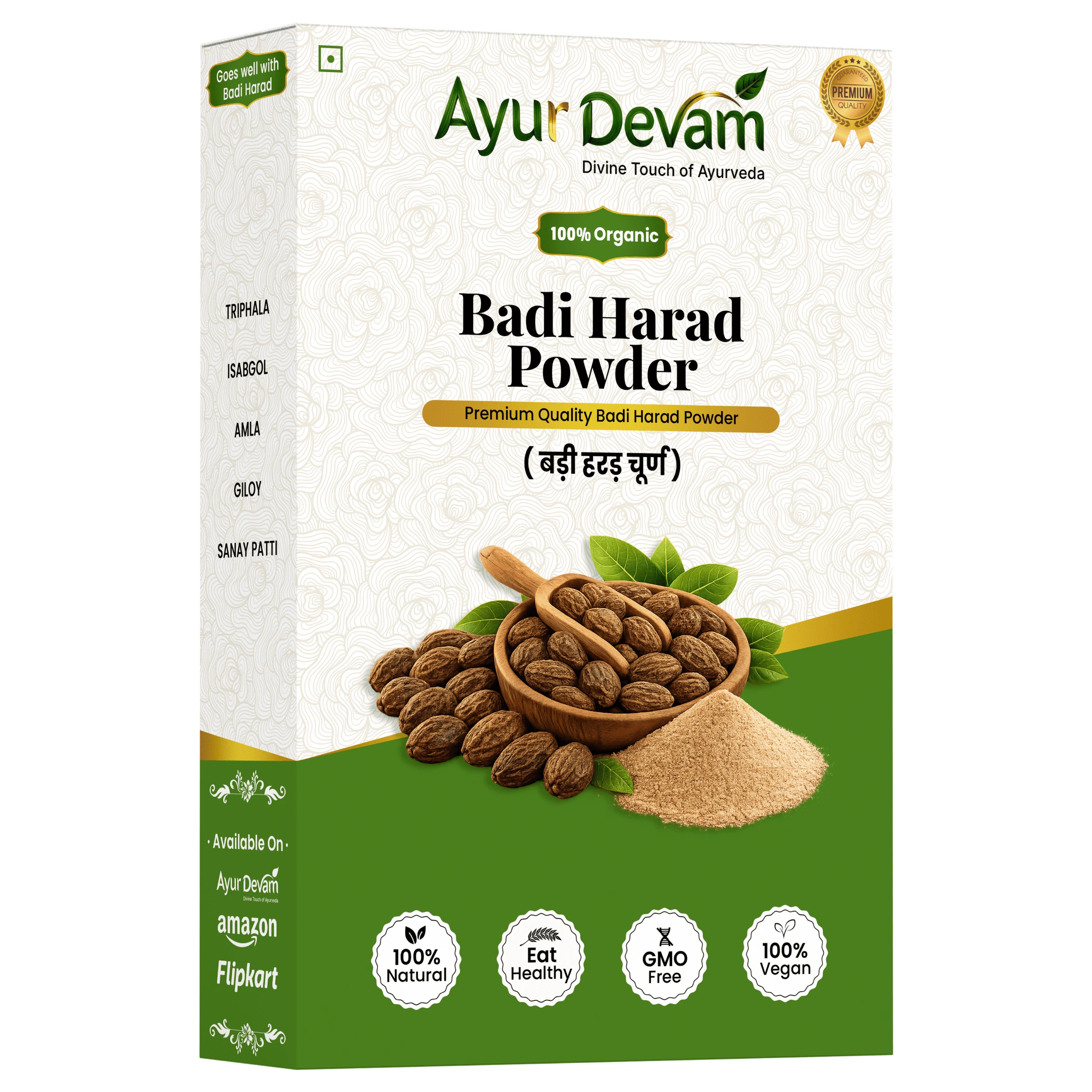 Badi Harad Powder, also known as Haritaki Powder, is a powerful Ayurvedic herb widely used for its digestive and detoxifying properties. It is one of the key ingredients in traditional formulations like Triphala and is highly valued for maintaining gut health.