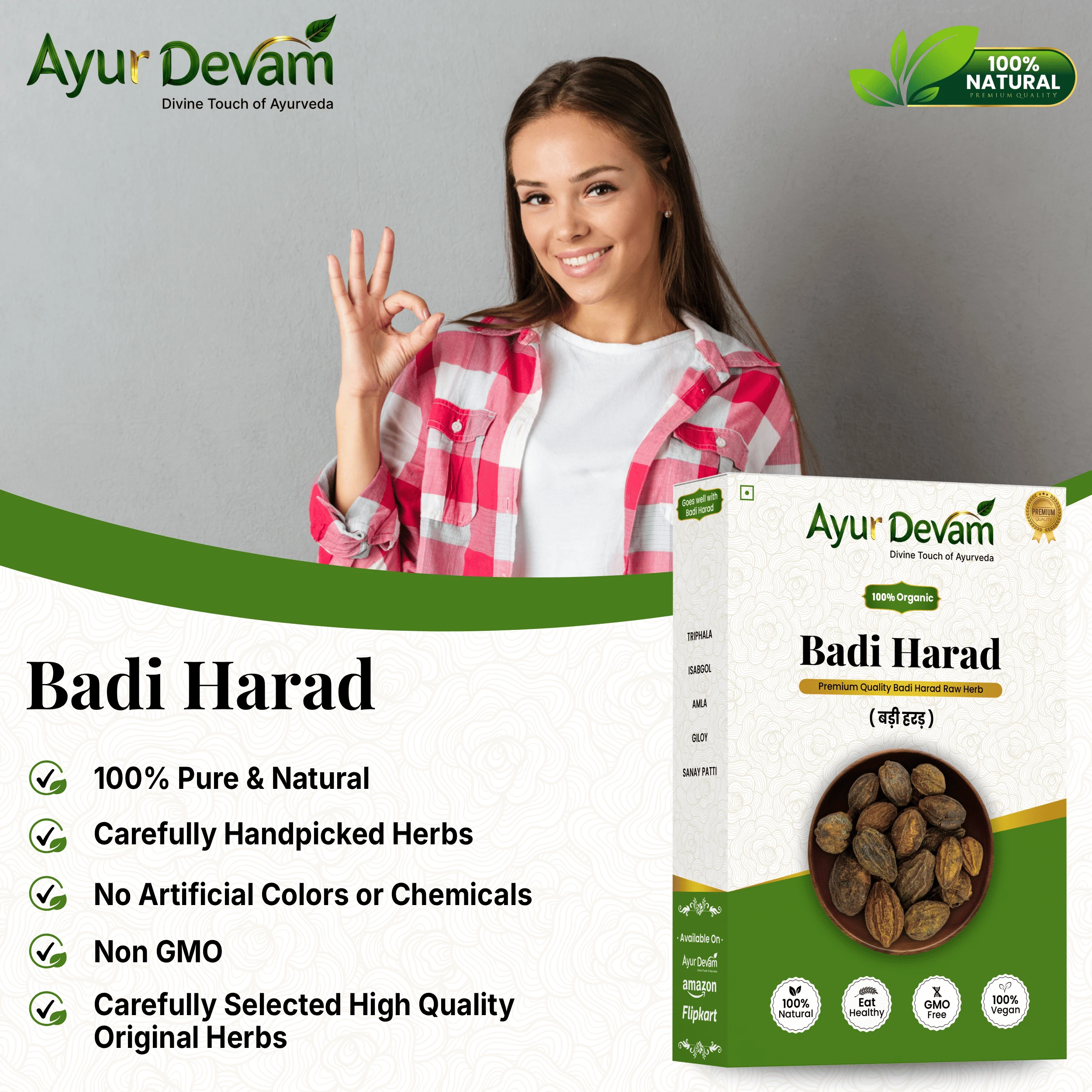 Badi Harad Raw, also known as Haritaki (Terminalia chebula), is a highly valued Ayurvedic fruit known for its powerful digestive and detoxifying properties. It is one of the key ingredients in traditional formulations like Triphala and has been used for centuries to promote gut health and internal cleansing.