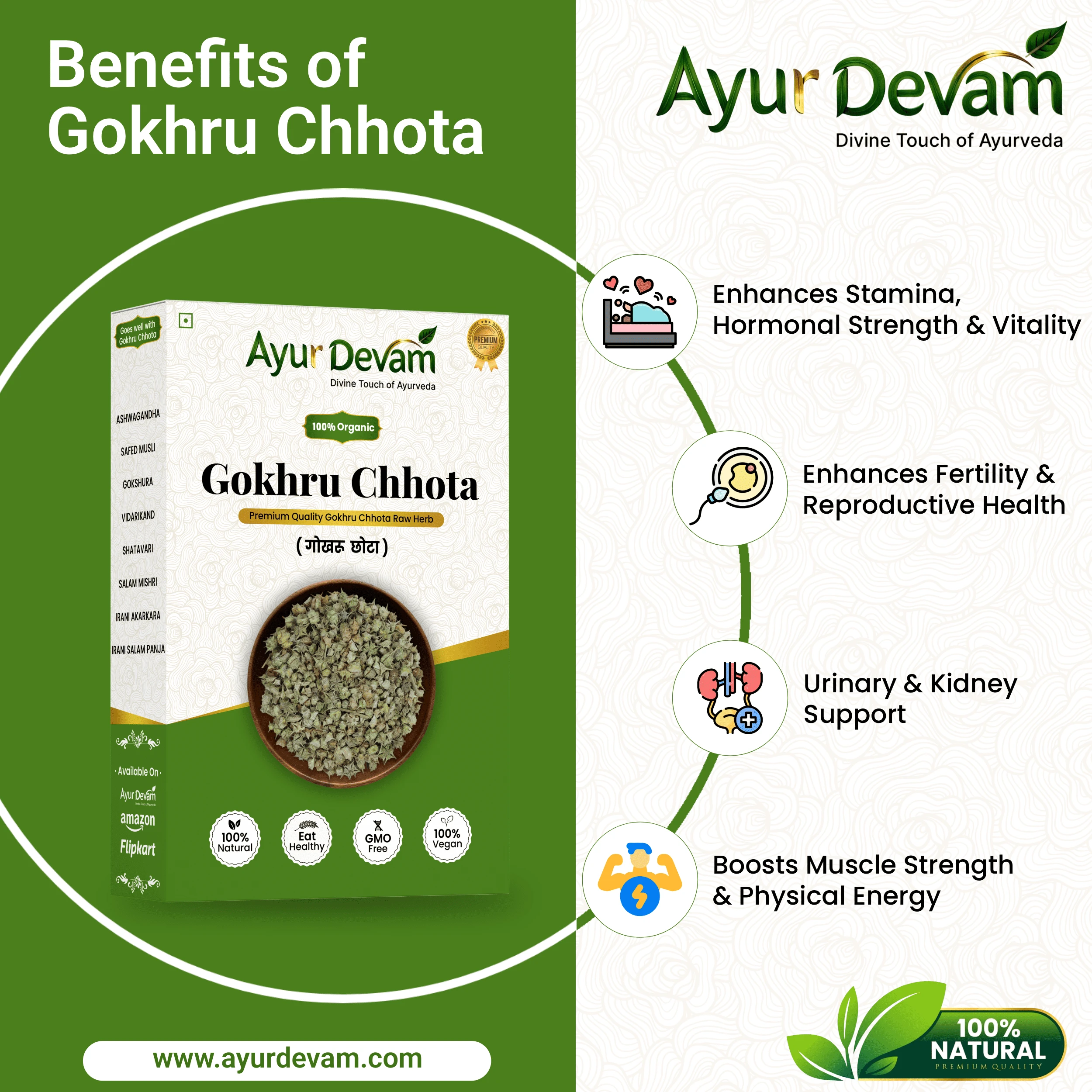 This powerful herb helps enhance physical strength, improve energy levels, and support reproductive health. It is also known for promoting healthy urinary function and maintaining overall body balance.