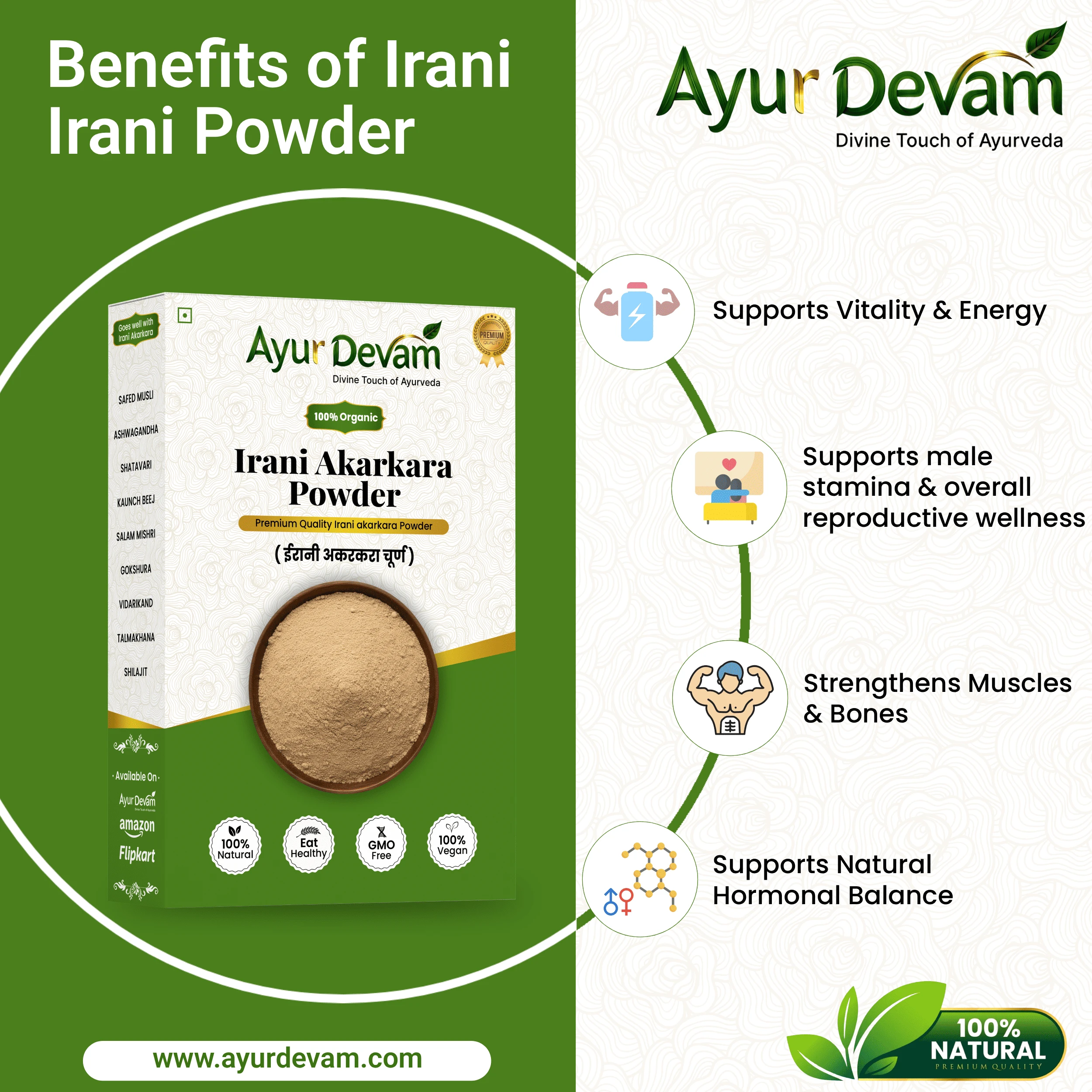 Irani Akarkara Powder is a premium natural herbal powder made from carefully selected high-quality Irani Akarkara roots. Known for its traditional use in Ayurveda and herbal medicine, this powder helps support overall strength, energy, stamina, and vitality.