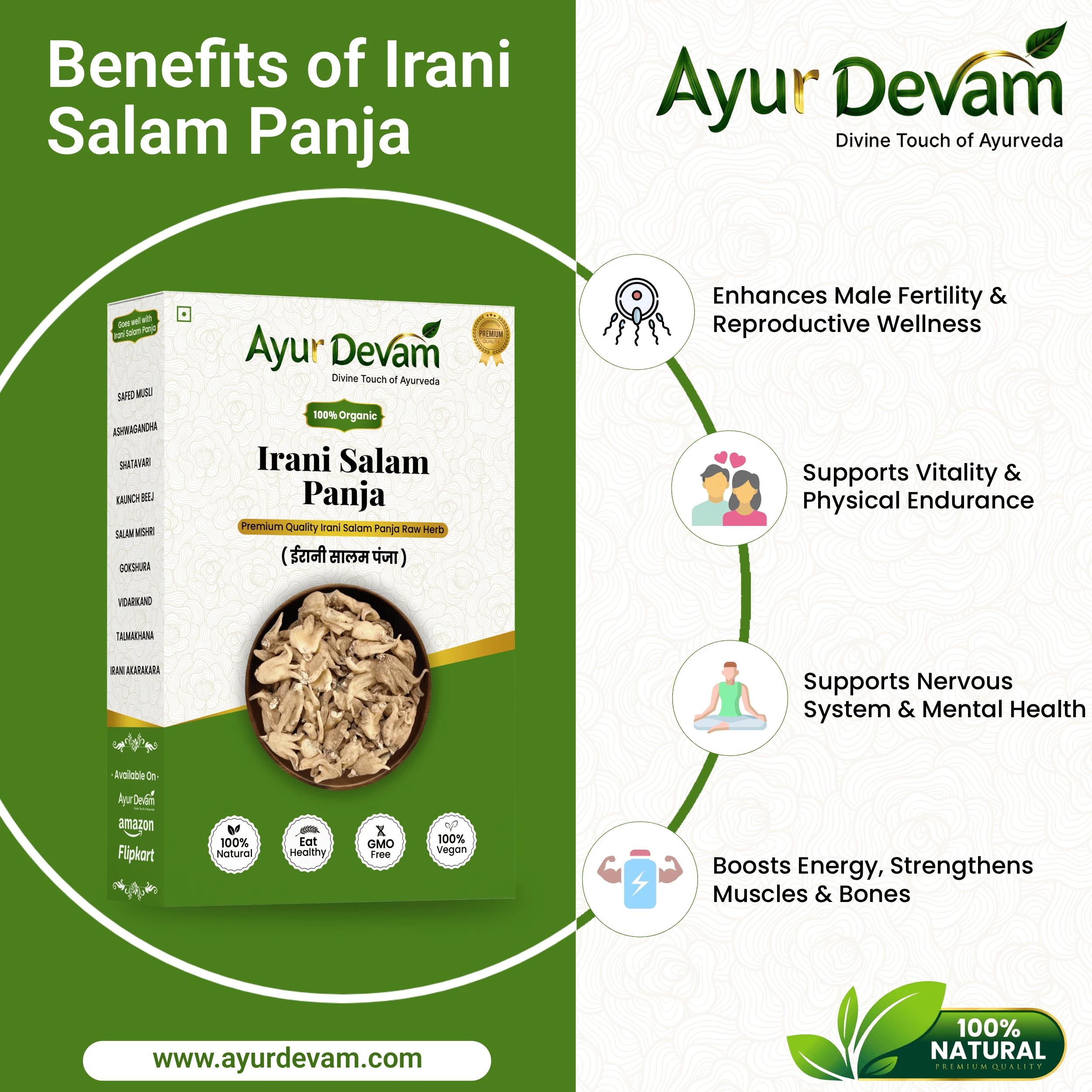 Irani Salam Panja Raw is the pure, unprocessed form of the powerful herbal root traditionally used in Ayurveda and herbal medicine. Carefully sourced from premium Irani plants, this whole root is known for its natural potency and therapeutic benefits.