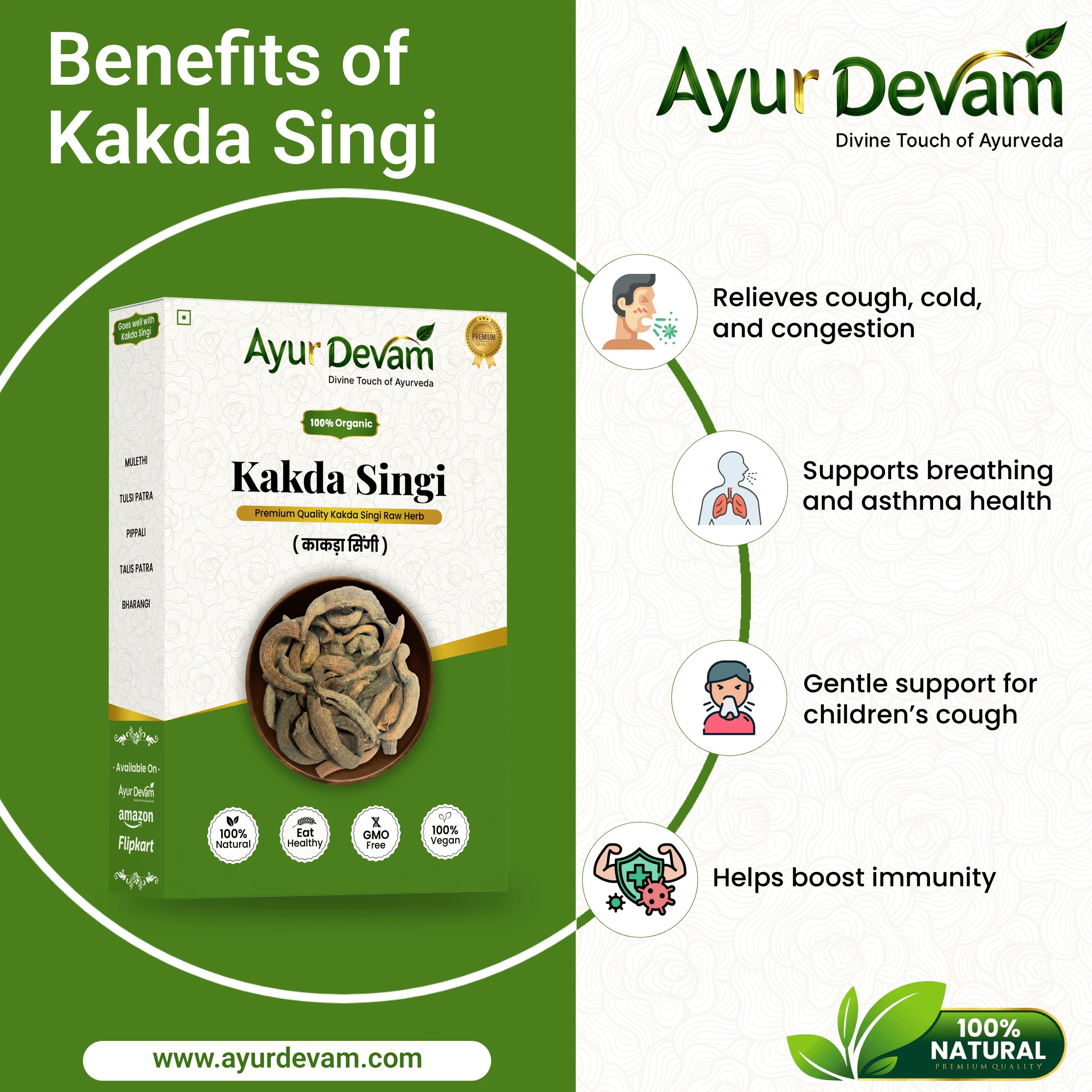 Traditionally used in Ayurveda, Kakda Singi helps in relieving cough, cold, asthma symptoms, and throat irritation. It is especially beneficial for children and adults suffering from chronic respiratory conditions. Its natural composition makes it a safe and effective addition to herbal remedies and home treatments.