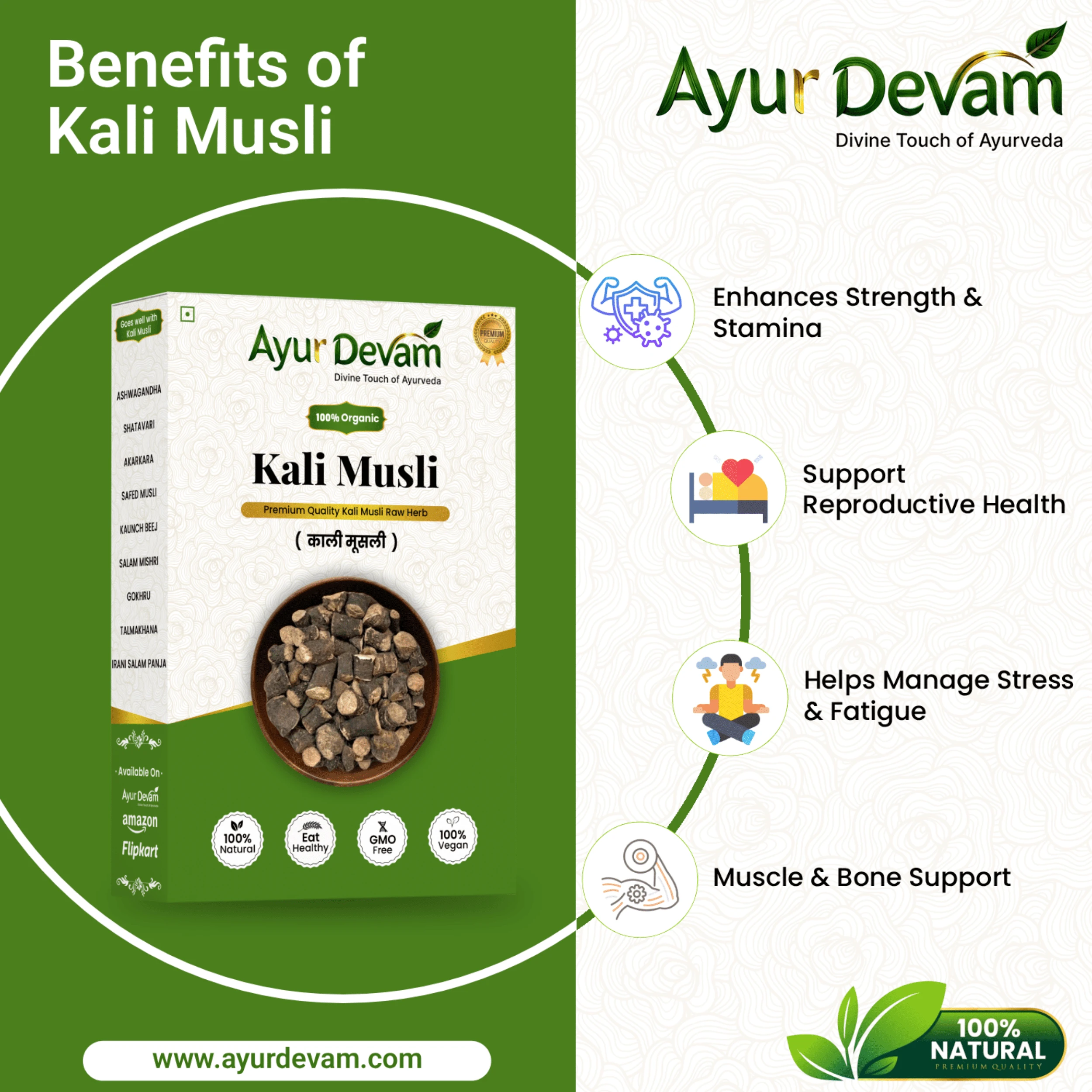 Kali Musli is widely known for promoting male wellness, improving energy levels, and supporting reproductive health. It also acts as a natural adaptogen, helping the body cope with stress, fatigue, and weakness. Its nourishing properties make it beneficial for maintaining overall health and vitality.