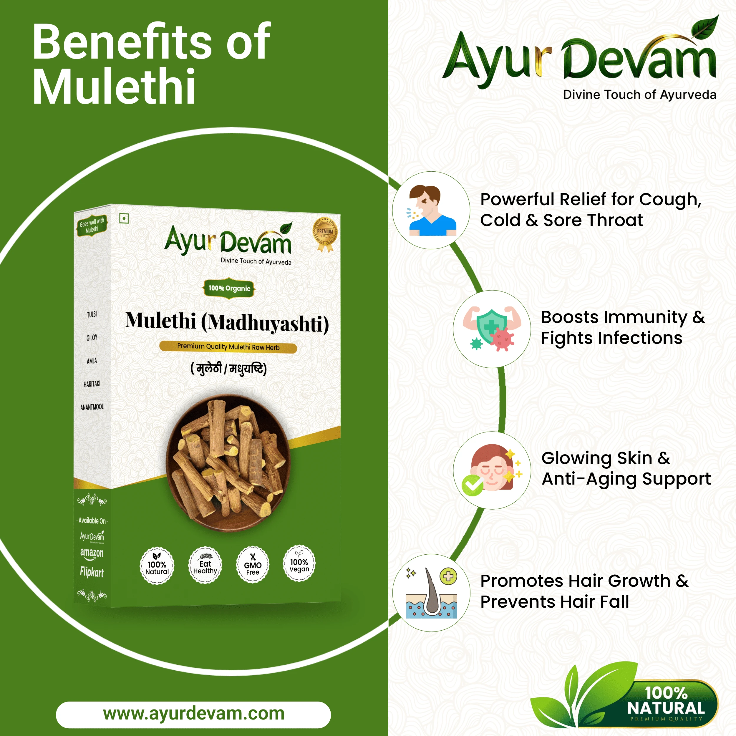 Rich in antioxidants, anti-inflammatory compounds, and natural bioactives, Mulethi Raw supports respiratory health, digestion, and skin wellness. Its therapeutic properties help soothe sore throats, reduce coughs, and improve digestion. When used externally, it can be ground or powdered to make skin packs that help reduce pigmentation, blemishes, and irritation.