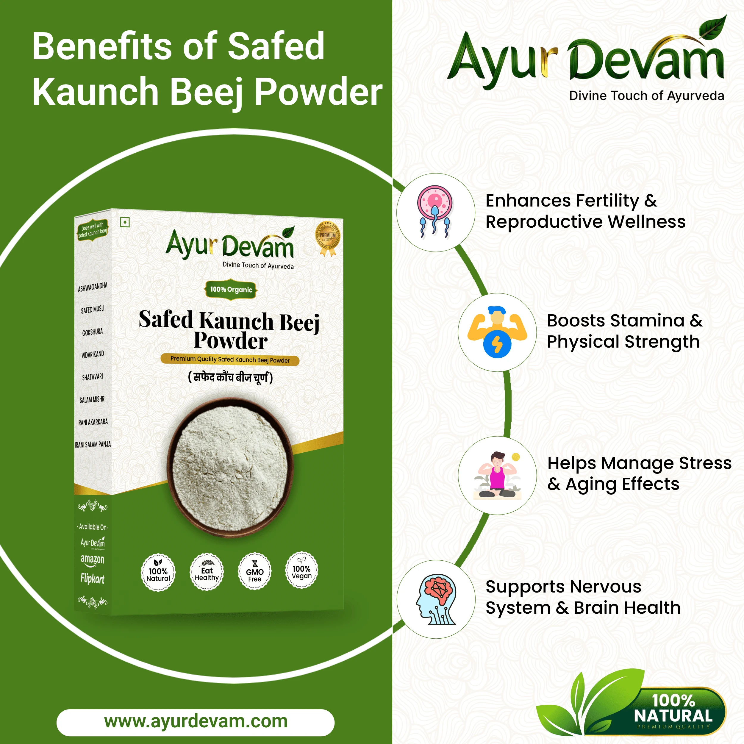 Safed Kaunch Beej Powder and other quality Safed Kaunchbeej Powders are made from carefully selected white Kaunch seeds (also called Mucuna pruriens), a traditional herbal ingredient widely used in Ayurveda for overall wellness. This natural powder supports energy, stamina, physical strength, and vitality, making it a valuable addition to your daily health routine.