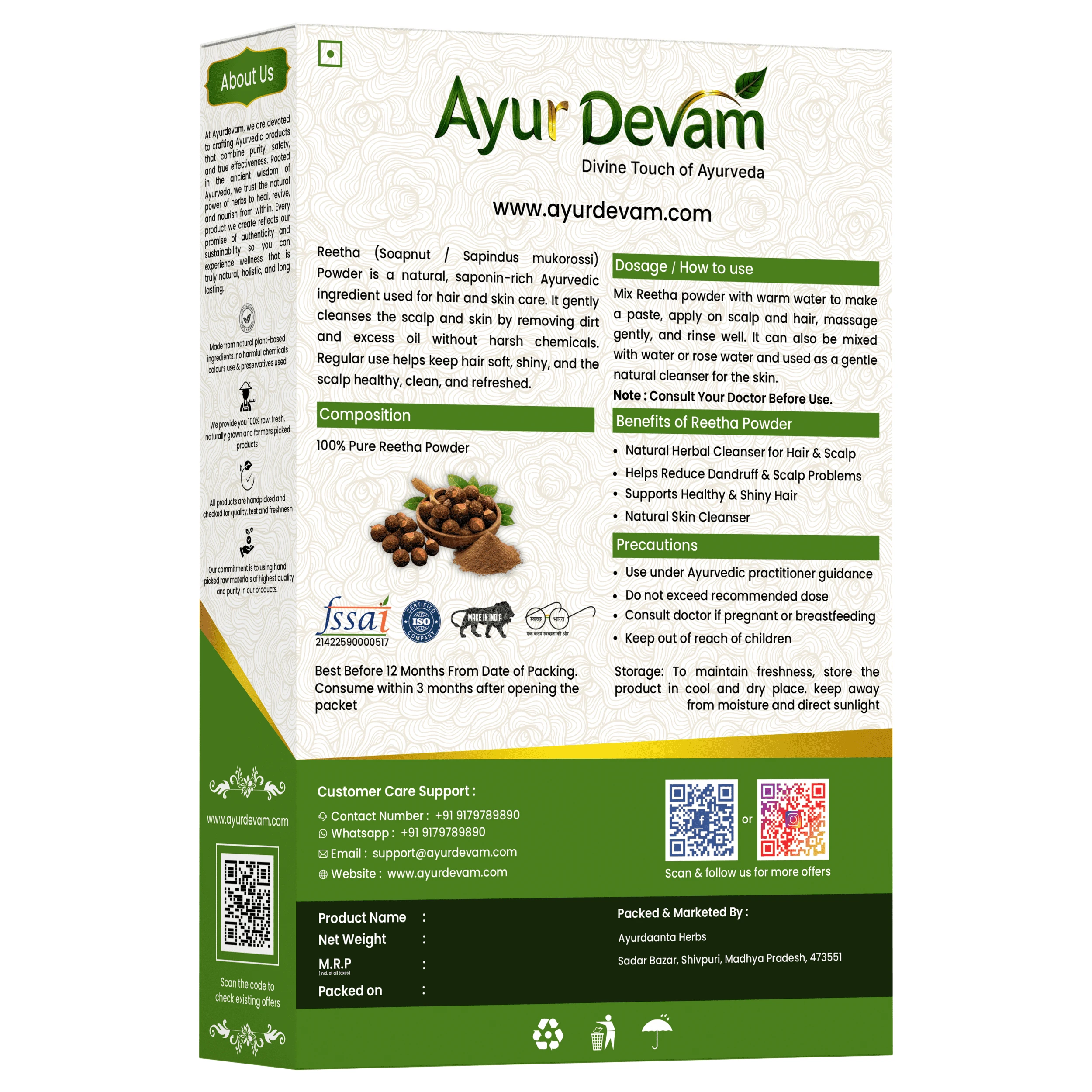 Reetha powder also helps strengthen hair roots, reduce dandruff, and promote healthy, shiny hair. It can be used alone or combined with other herbs like amla and shikakai for enhanced results.