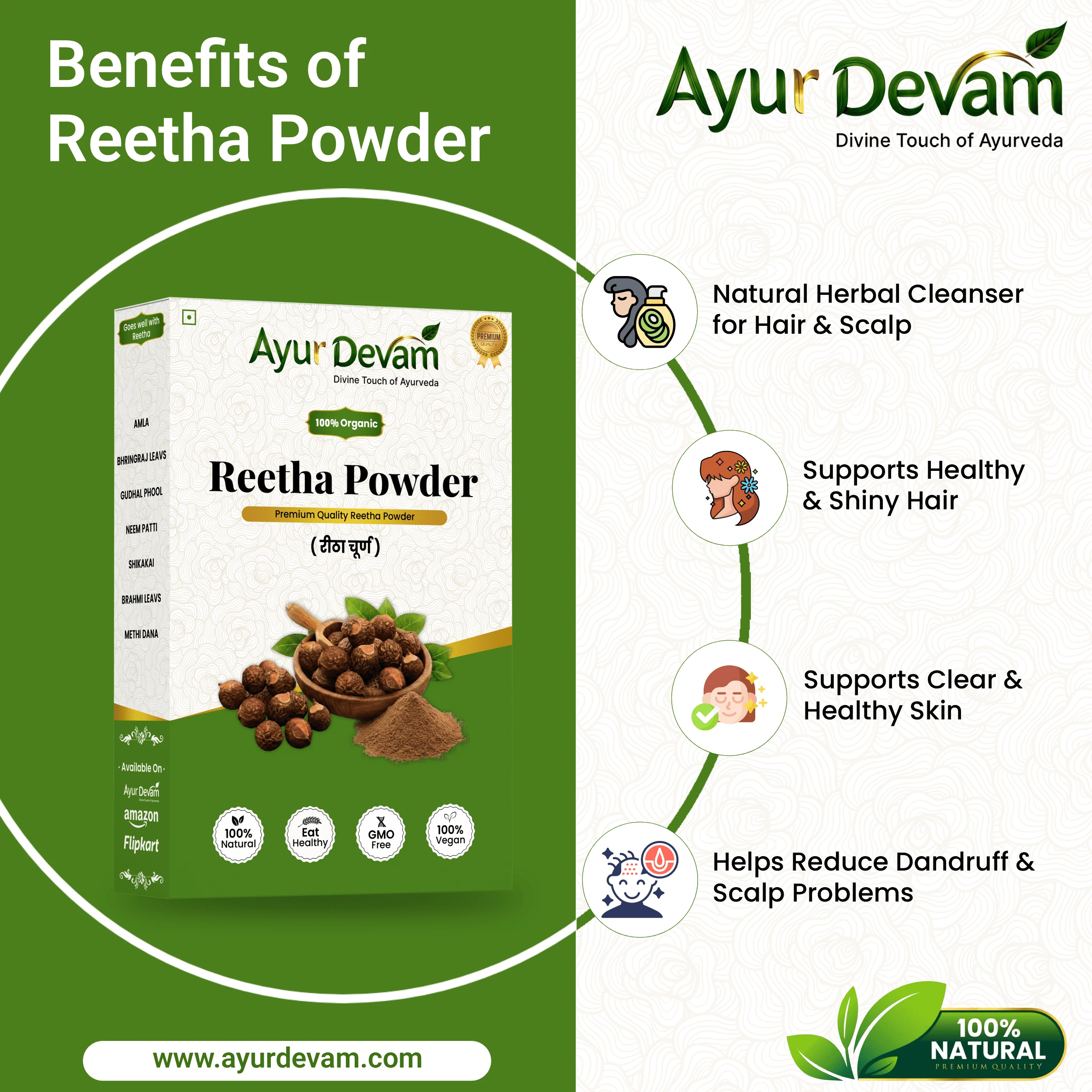 Rich in natural saponins, Reetha Powder works as a mild, chemical-free cleanser that effectively removes dirt, oil, and impurities from the scalp and hair without stripping natural moisture. It is an excellent alternative to synthetic shampoos and is suitable for all hair types, including sensitive scalps.