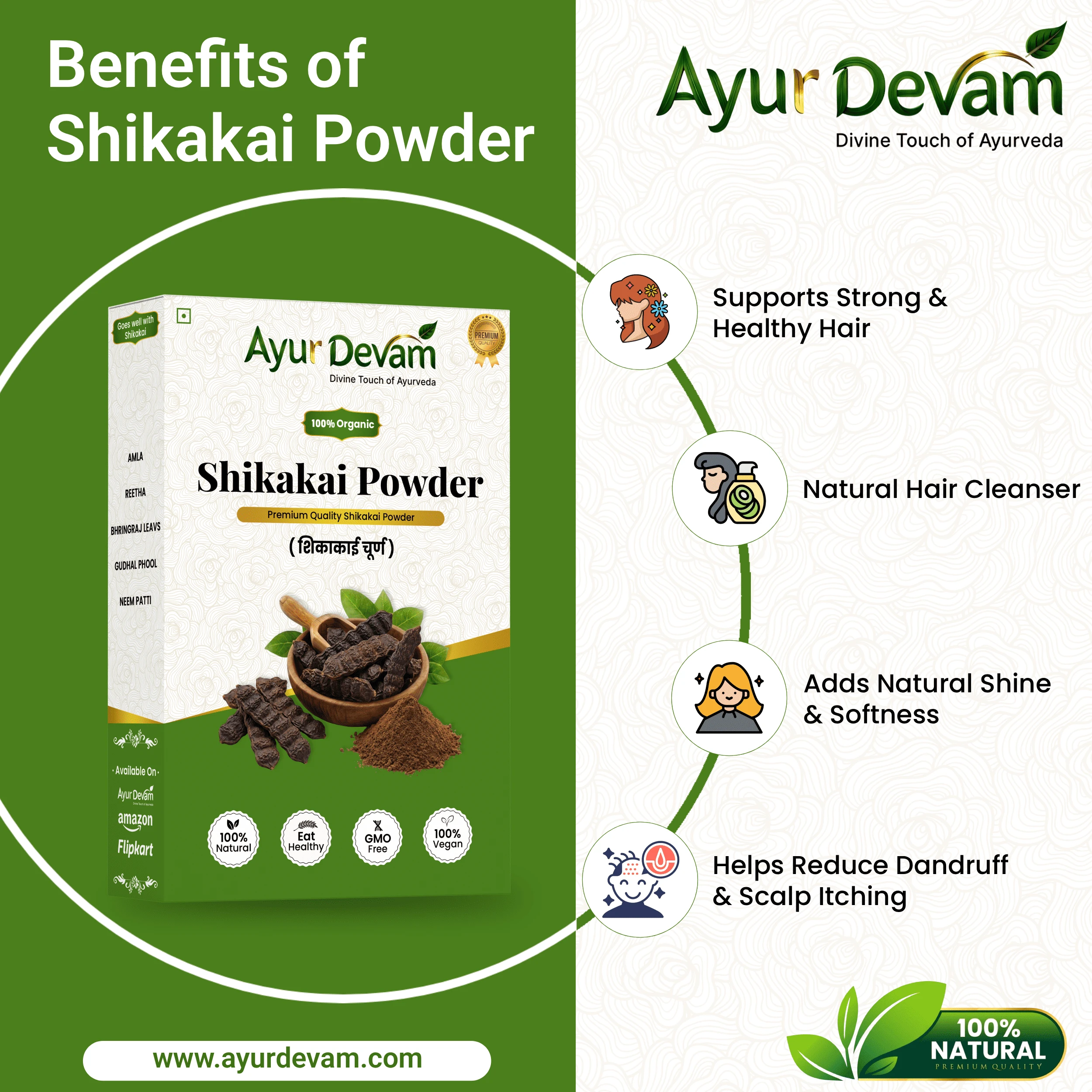 Rich in vitamins and antioxidants, Shikakai Powder helps strengthen hair roots, reduce dandruff, and promote healthy hair growth. Unlike chemical shampoos, it maintains the scalp’s natural pH balance, leaving hair soft, shiny, and manageable.
